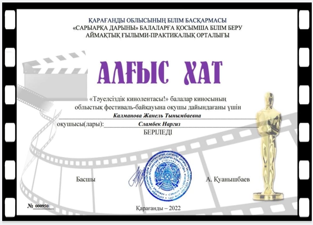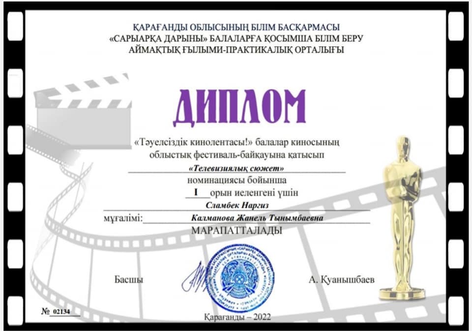 Қарағанды облысының білім басқармасы “Сарыарқа дарыны” балаларға қосымша білім беру аймақтық ғылыми-практикалық орталығының ұйымдастыруымен “Тәуелсіздік кинолентасы!” балалар киносының облыстық фестиваль-байқауына қатысып, жүлделі І орынды мектебіміздің 8 “В” сынып оқушысы Сламбек Наргиз иеленді. Жетекшісі: Калманова Жанель Тынымбаевна. Байқауда ең өзекті “Жезқазған қаласының экологиялық мәселелері қалай шешіледі?” тақырыбында репортаж түсірілді. Репортаждың толық нұсқасын @orken.news парақшасынан көре аласыздар.